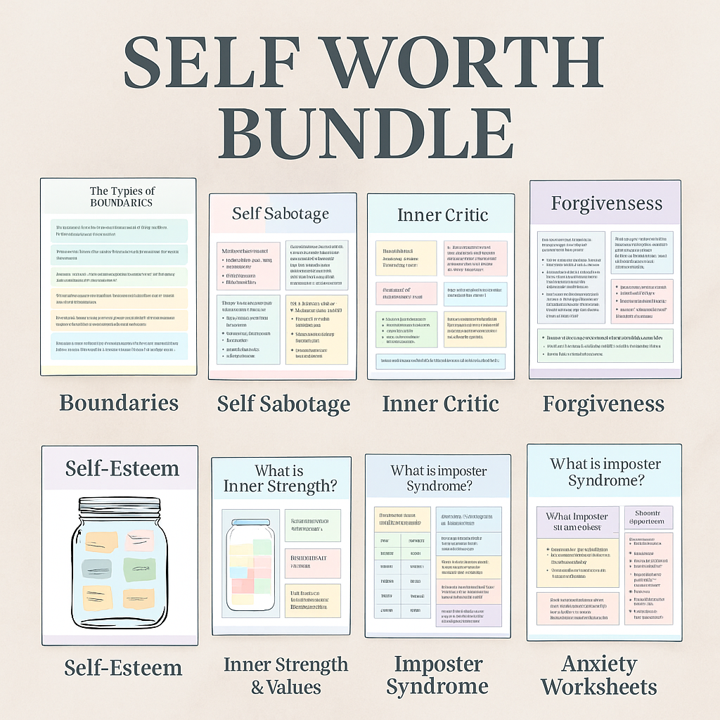 Boost self-worth with this printable bundle covering boundaries, self sabotage, inner critic, forgiveness, self-esteem, inner strength, values, and imposter syndrome to support personal growth and confidence.